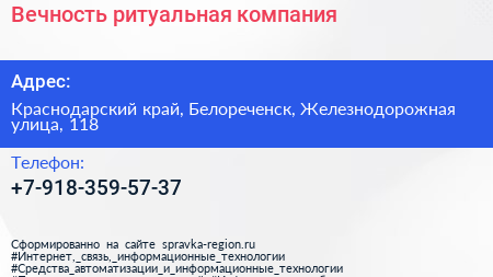 Вечность, ритуальная компания по адресу Краснодарский край, Белореченск, Железнодорожная улица, 118 в дальнейшем Организация, размещена в следующих категориях: