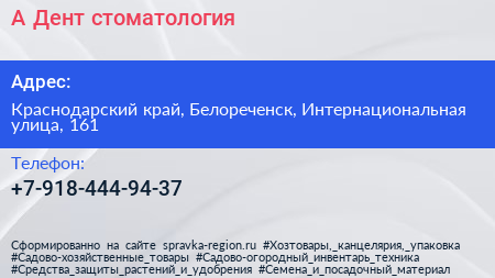 А-Дент, стоматология по адресу Краснодарский край, Белореченск, Интернациональная улица, 161 в дальнейшем Организация, размещена в следующих категориях: