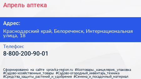 Апрель, аптека по адресу Краснодарский край, Белореченск, Интернациональная улица, 18 в дальнейшем Организация, размещена в следующих категориях: