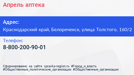 Апрель, аптека по адресу Краснодарский край, Белореченск, улица Толстого, 160/2 в дальнейшем Организация, размещена в следующих категориях: