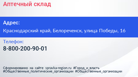 Аптечный склад по адресу Краснодарский край, Белореченск, улица Победы, 16 в дальнейшем Организация, размещена в следующих категориях: