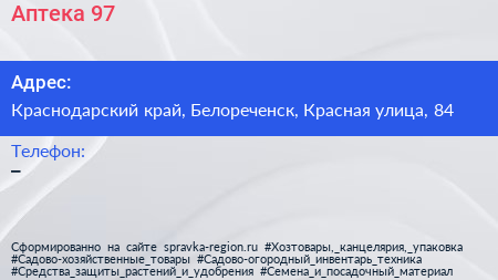 Аптека №97 по адресу Краснодарский край, Белореченск, Красная улица, 84 в дальнейшем Организация, размещена в следующих категориях:
