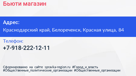 Бьюти, магазин по адресу Краснодарский край, Белореченск, Красная улица, 84 в дальнейшем Организация, размещена в следующих категориях: