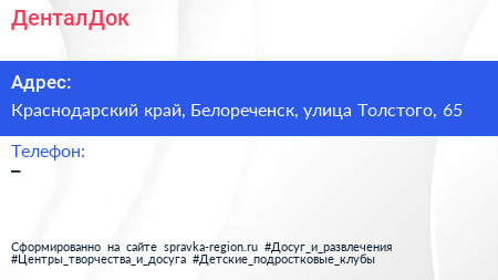ДенталДок по адресу Краснодарский край, Белореченск, улица Толстого, 65 в дальнейшем Организация, размещена в следующих категориях: