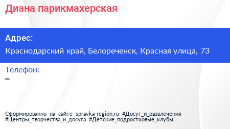 Диана, парикмахерская по адресу Краснодарский край, Белореченск, Красная улица, 73 в дальнейшем Организация, размещена в следующих категориях: