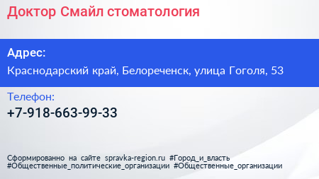 Доктор Смайл, стоматология по адресу Краснодарский край, Белореченск, улица Гоголя, 53 в дальнейшем Организация, размещена в следующих категориях: