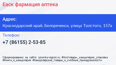 Еаск-фармация, аптека по адресу Краснодарский край, Белореченск, улица Толстого, 157а в дальнейшем Организация, размещена в следующих категориях: