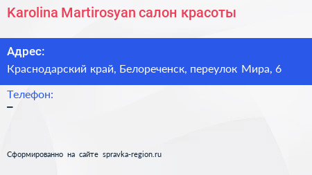 Karolina Martirosyan, салон красоты по адресу Краснодарский край, Белореченск, переулок Мира, 6 в дальнейшем Организация, размещена в следующих категориях:
