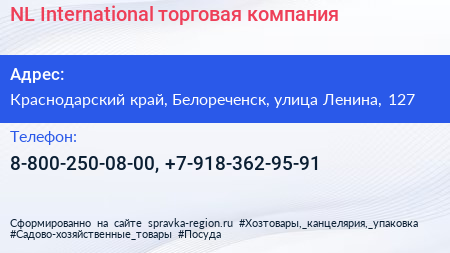 NL International, торговая компания по адресу Краснодарский край, Белореченск, улица Ленина, 127 в дальнейшем Организация, размещена в следующих категориях: