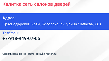Калитка, сеть салонов дверей по адресу Краснодарский край, Белореченск, улица Чапаева, 68а в дальнейшем Организация, размещена в следующих категориях: