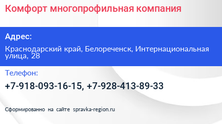 Комфорт, многопрофильная компания по адресу Краснодарский край, Белореченск, Интернациональная улица, 28 в дальнейшем Организация, размещена в следующих категориях: