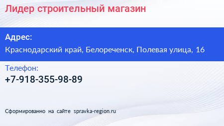 Лидер, строительный магазин по адресу Краснодарский край, Белореченск, Полевая улица, 16 в дальнейшем Организация, размещена в следующих категориях: