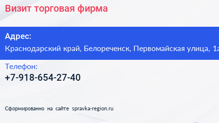 Визит, торговая фирма по адресу Краснодарский край, Белореченск, Первомайская улица, 1а в дальнейшем Организация, размещена в следующих категориях: