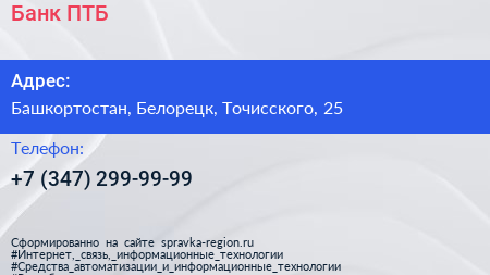 Банк ПТБ по адресу Башкортостан, Белорецк, Точисского, 25 в дальнейшем Организация, размещена в следующих категориях: