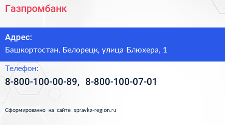 Газпромбанк по адресу Башкортостан, Белорецк, улица Блюхера, 1 в дальнейшем Организация, размещена в следующих категориях: