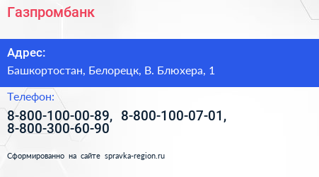 Газпромбанк по адресу Башкортостан, Белорецк, В. Блюхера, 1 в дальнейшем Организация, размещена в следующих категориях: