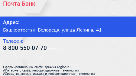 Почта Банк по адресу Башкортостан, Белорецк, улица Ленина, 41 в дальнейшем Организация, размещена в следующих категориях: