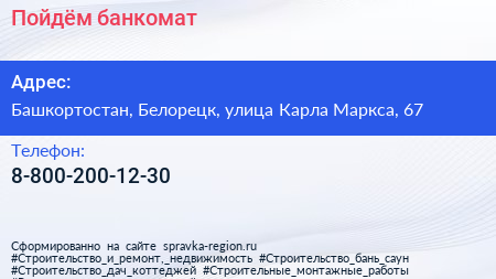 Пойдём!, банкомат по адресу Башкортостан, Белорецк, улица Карла Маркса, 67 в дальнейшем Организация, размещена в следующих категориях: