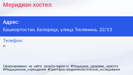 Меридиан, хостел по адресу Башкортостан, Белорецк, улица Тюленина, 22/13 в дальнейшем Организация, размещена в следующих категориях:
