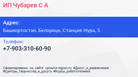 ИП Чубарев С.А. по адресу Башкортостан, Белорецк, Станция Нура, 5 в дальнейшем Организация, размещена в следующих категориях: