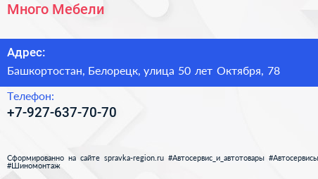Много Мебели по адресу Башкортостан, Белорецк, улица 50 лет Октября, 78 в дальнейшем Организация, размещена в следующих категориях: