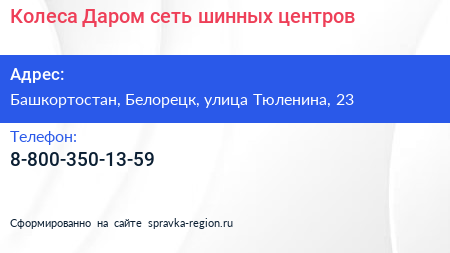 Колеса Даром, сеть шинных центров по адресу Башкортостан, Белорецк, улица Тюленина, 23 в дальнейшем Организация, размещена в следующих категориях: