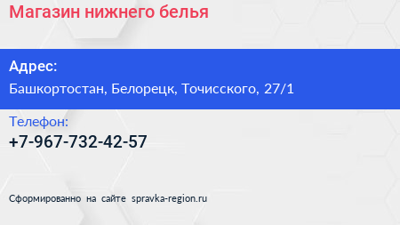 Магазин нижнего белья по адресу Башкортостан, Белорецк, Точисского, 27/1 в дальнейшем Организация, размещена в следующих категориях: