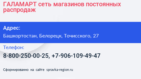 ГАЛАМАРТ, сеть магазинов постоянных распродаж по адресу Башкортостан, Белорецк, Точисского, 27 в дальнейшем Организация, размещена в следующих категориях: