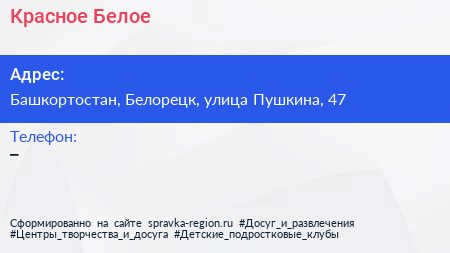 Красное & Белое по адресу Башкортостан, Белорецк, улица Пушкина, 47 в дальнейшем Организация, размещена в следующих категориях: