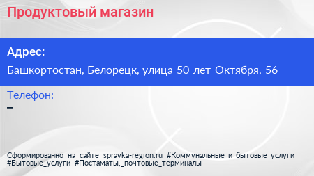 Продуктовый магазин по адресу Башкортостан, Белорецк, улица 50 лет Октября, 56 в дальнейшем Организация, размещена в следующих категориях: