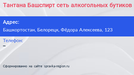Тантана-Башспирт, сеть алкогольных бутиков по адресу Башкортостан, Белорецк, Фёдора Алексеева, 123 в дальнейшем Организация, размещена в следующих категориях: