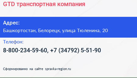 GTD, транспортная компания по адресу Башкортостан, Белорецк, улица Тюленина, 20 в дальнейшем Организация, размещена в следующих категориях: