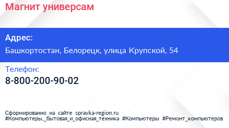 Магнит, универсам по адресу Башкортостан, Белорецк, улица Крупской, 54 в дальнейшем Организация, размещена в следующих категориях:
