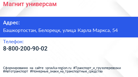 Магнит, универсам по адресу Башкортостан, Белорецк, улица Карла Маркса, 54 в дальнейшем Организация, размещена в следующих категориях: