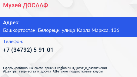 Музей ДОСААФ по адресу Башкортостан, Белорецк, улица Карла Маркса, 136 в дальнейшем Организация, размещена в следующих категориях: