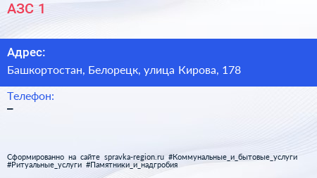 АЗС №1 по адресу Башкортостан, Белорецк, улица Кирова, 178 в дальнейшем Организация, размещена в следующих категориях: