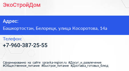 ЭкоСтройДом по адресу Башкортостан, Белорецк, улица Косоротова, 14а в дальнейшем Организация, размещена в следующих категориях: