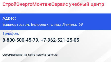 СтройЭнергоМонтажСервис, учебный центр по адресу Башкортостан, Белорецк, улица Ленина, 69 в дальнейшем Организация, размещена в следующих категориях: