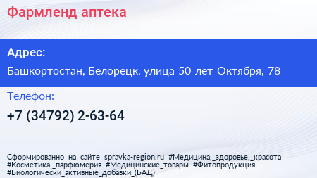 Фармленд, аптека по адресу Башкортостан, Белорецк, улица 50 лет Октября, 78 в дальнейшем Организация, размещена в следующих категориях: