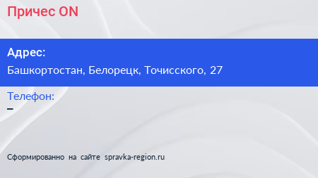 Причес`ON по адресу Башкортостан, Белорецк, Точисского, 27 в дальнейшем Организация, размещена в следующих категориях: