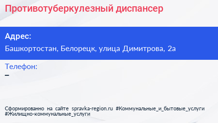 Противотуберкулезный диспансер по адресу Башкортостан, Белорецк, улица Димитрова, 2а в дальнейшем Организация, размещена в следующих категориях:
