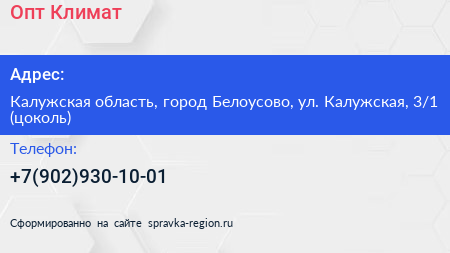 «Опт Климат» по адресу Калужская область, город Белоусово, ул. Калужская, 3/1 (цоколь) в дальнейшем Организация, размещена в следующих категориях: