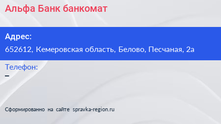 Альфа-Банк, банкомат по адресу 652612, Кемеровская область, Белово, Песчаная, 2а в дальнейшем Организация, размещена в следующих категориях:
