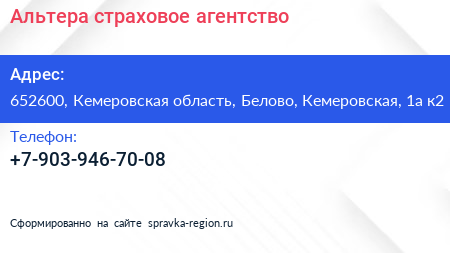 Альтера, страховое агентство по адресу 652600, Кемеровская область, Белово, Кемеровская, 1а к2 в дальнейшем Организация, размещена в следующих категориях: