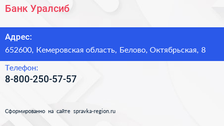 Банк Уралсиб по адресу 652600, Кемеровская область, Белово, Октябрьская, 8 в дальнейшем Организация, размещена в следующих категориях:
