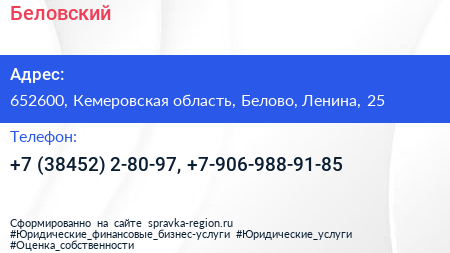 Беловский по адресу 652600, Кемеровская область, Белово, Ленина, 25 в дальнейшем Организация, размещена в следующих категориях: