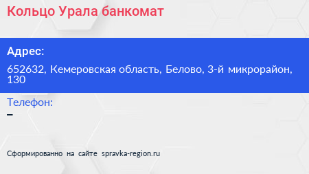 Кольцо Урала, банкомат по адресу 652632, Кемеровская область, Белово, 3-й микрорайон, 130 в дальнейшем Организация, размещена в следующих категориях: