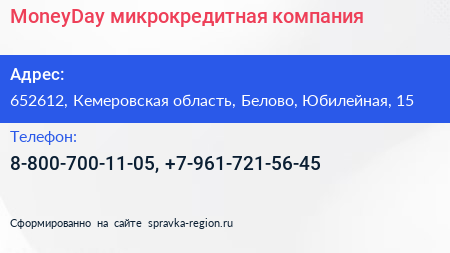MoneyDay, микрокредитная компания по адресу 652612, Кемеровская область, Белово, Юбилейная, 15 в дальнейшем Организация, размещена в следующих категориях: