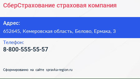 СберСтрахование, страховая компания по адресу 652645, Кемеровская область, Белово, Ермака, 3 в дальнейшем Организация, размещена в следующих категориях: