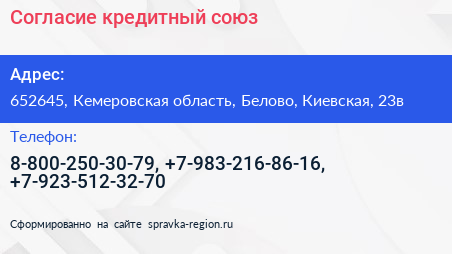 Согласие, кредитный союз по адресу 652645, Кемеровская область, Белово, Киевская, 23в в дальнейшем Организация, размещена в следующих категориях: